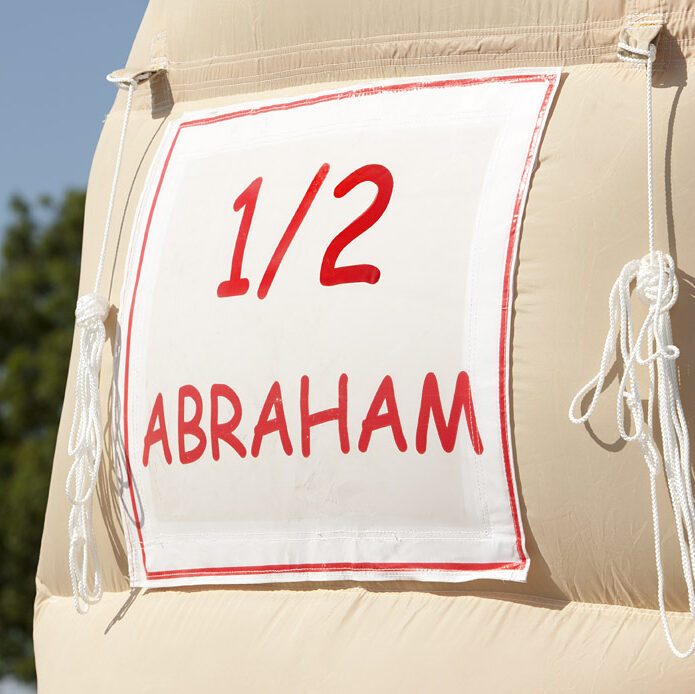 Deze zeer unieke halve Abraham Feestend met een hoogte van 3,5m kan als blikvanger worden gebruikt voor de 25-jarige. Wij hebben de term halve Abraham dan ook heel letterlijk genomen. De opblaasbare pop heeft aan de zijkant een banner met 1/2 Abraham er op.