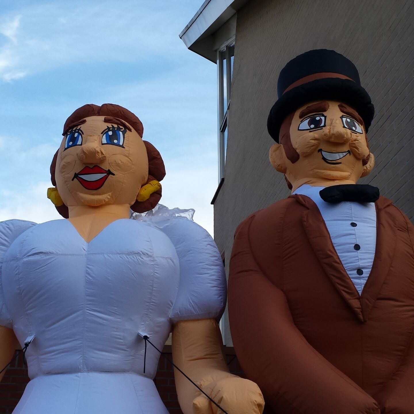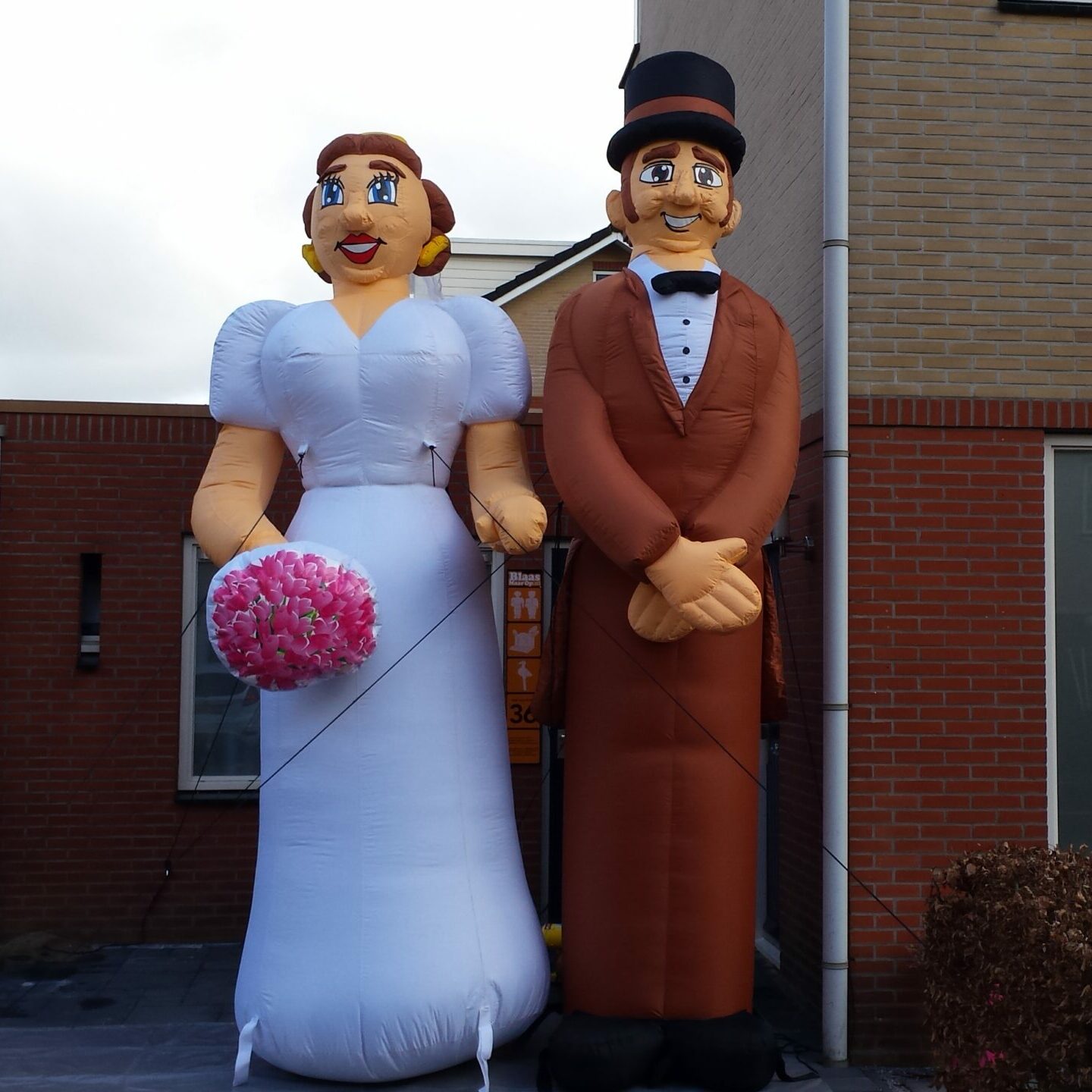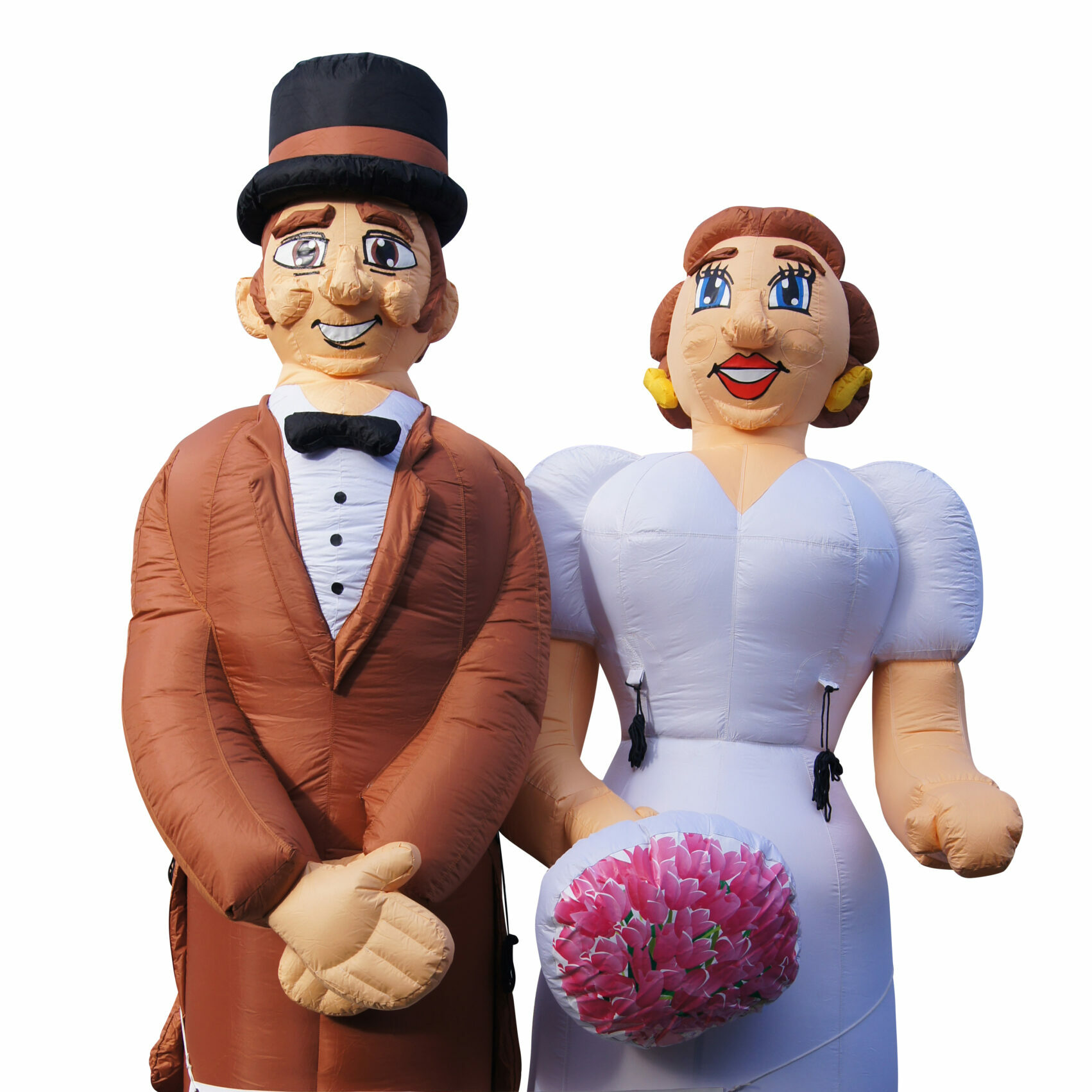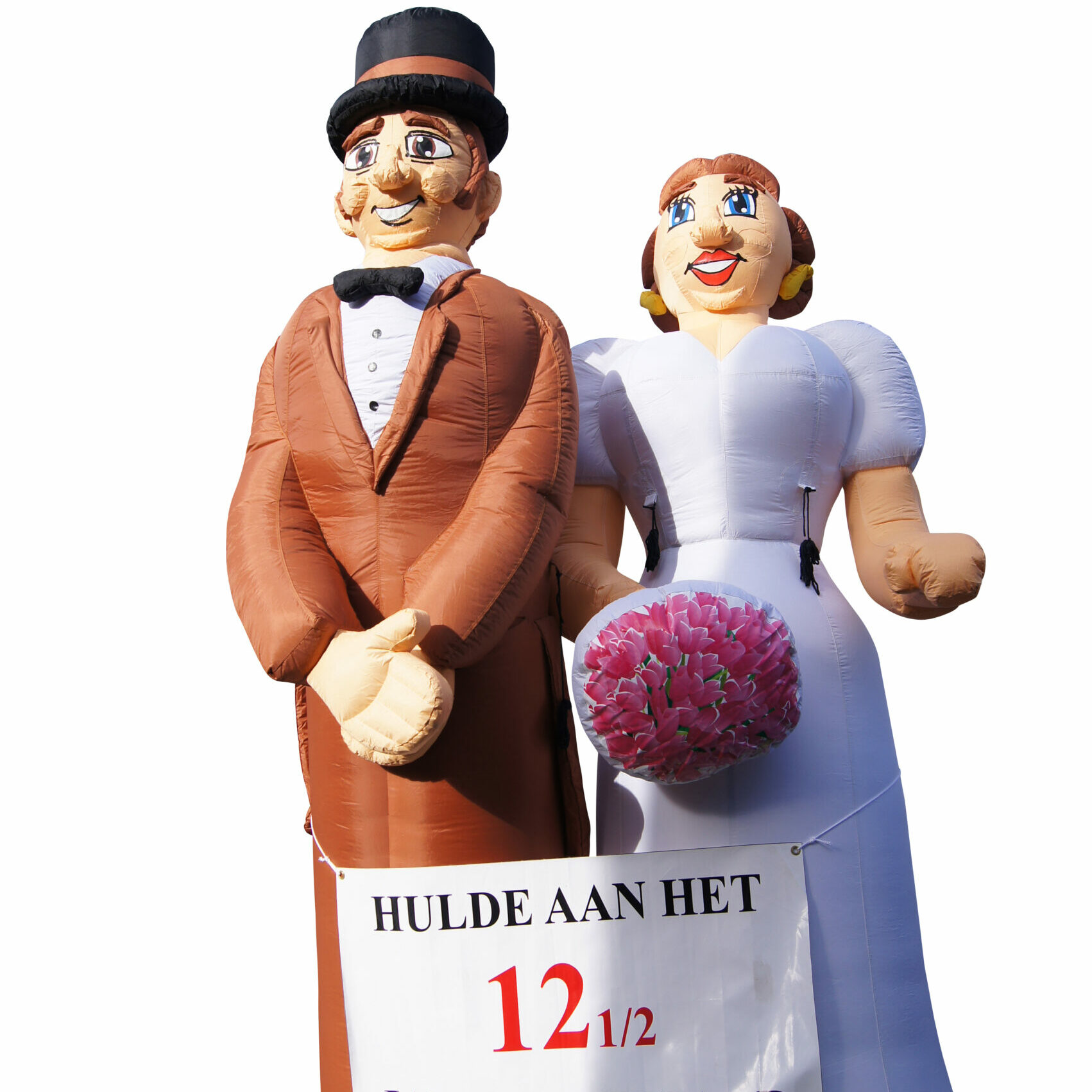 Opblaasbaar bruidspaar 4m, het bruidspaar bestaat uit de Bruid en de Bruidegom en zijn 2 los staande poppen. De poppen worden dan ook geleverd met 2 blowers.