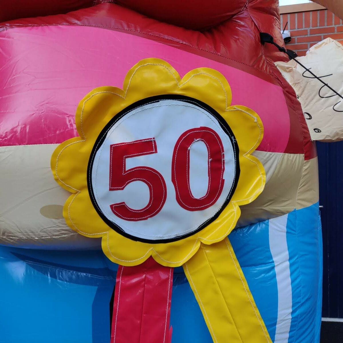 De opblaasbare Sarah Tokkie met een hoogte van 4 meter heeft een “mooi” navel truitje aan en een grote Anita knot op de kop. De pop is voorzien van een button op de buik met hierop de leeftijd van de jarige. De buttons zijn bij ons verkrijgbaar met verschillende opdrukken; 25, 40, 50 of 60